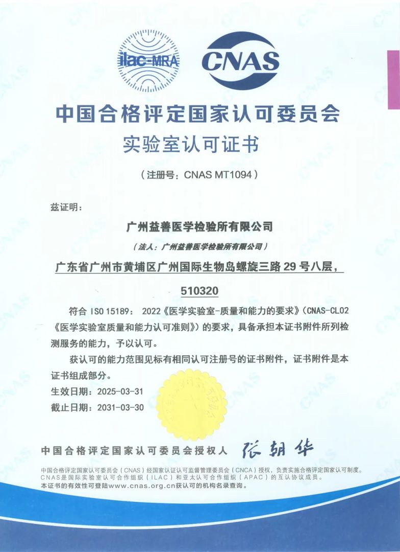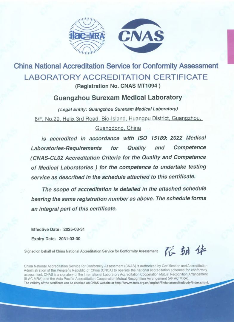 ISO 15189是国际标准化组织发布的针对医学实验室质量和能力要求的国际认可标准。CNAS作为国内唯一负责实施 ISO 15189认可的官方机构,是国际实验室认可合作组织(ILAC)和亚太认可合作组织(APAC)的互认协议成员。通过该认可的实验室,其检测质量达到国际规范化水平,检验报告更具准确性和权威性,相关项目检验结果可在国际数千家实验室中实现互认。