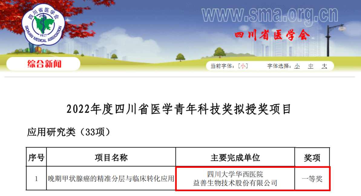 近日,四川省医学会公示2022年度四川省医学(青年)科技奖拟授奖项目名单中,益善生物技术股份有限公司与华西医院共同完成的《晚期甲状腺癌的精准分层与临床转化应用》项目荣获四川省医学青年科技一等奖。