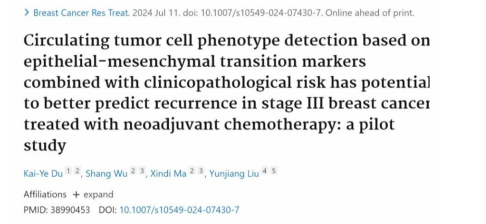 ● 研究题目:一项初步研究表明,基于上皮-间质转化标志物结合临床病理风险的循环肿瘤细胞表型检测有可能更好地预测接受新辅助化疗的III期乳腺癌的复发