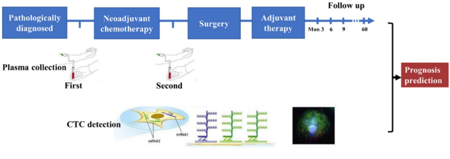 在病理确诊为乳腺癌后/新辅助治疗前和新辅助化疗后/肿瘤切除前分别采集5ml外周血,采用CanPatrol® CTC可视化液体活检平台对外周血中CTC进行分离鉴定及EMT分型分析。该技术采用不依赖特定标志物的纳米膜分离方法,全面富集所有类型的CTC及CTC细胞团;通过多重mRNA荧光原位杂交法,即使用多组上皮、间质和CD45探针,实现CTC的EMT分子分型。