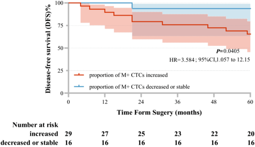 无论以CTC计数或EMT表型分析,CTC数量增加均表明较差的DFS。此外,还分析了CTC各类型比例的变化与DFS之间的关系。患者在新辅助治疗后间质型CTC比例增加的患者预后较差,其5年DFS为69.0%,而间质型CTC比例未增加的患者DFS为100%。表明间质型CTC比例增加与DFS降低相关(图2)。