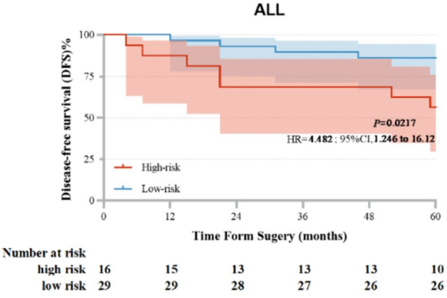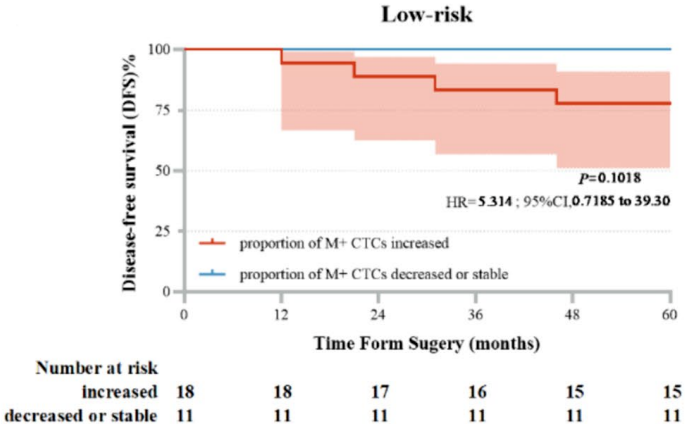在结合临床病理风险的分析中,Kaplan-Meier分析表明与低危肿瘤患者相比,高危肿瘤复发风险升高。在两个亚组中,特别是低风险亚组中间质型CTC比例增加的患者表现出更差的DFS。CTC状态低风险和临床病理低风险的患者复发风险较低,5年DFS为100%。相比之下,CTC状态高风险和临床病理高风险亚组患者的5年DFS最低,为50.0%(图3)。