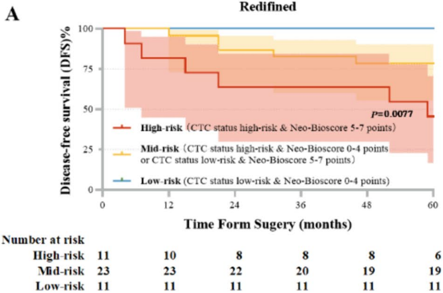 基于以上结果,将复发风险重新定义为:CTC状态为低风险且Neo-Bioscore为0-4的患者为低风险,CTC状态为高风险且Neo-Bioscore为5-7的患者为高风险,其他患者(CTC状态为高风险且Neo-Bioscore为0-4,或CTC状态为低风险且Neo-Bioscore为0-4)为中风险。Kaplan-Meier分析显示,III期乳腺癌患者新辅助化疗后的复发风险可以通过新定义的风险分层标准进行有效分层:低危、中危和高危患者的5年DFS分别为100.0%、77.3%和50.0%。