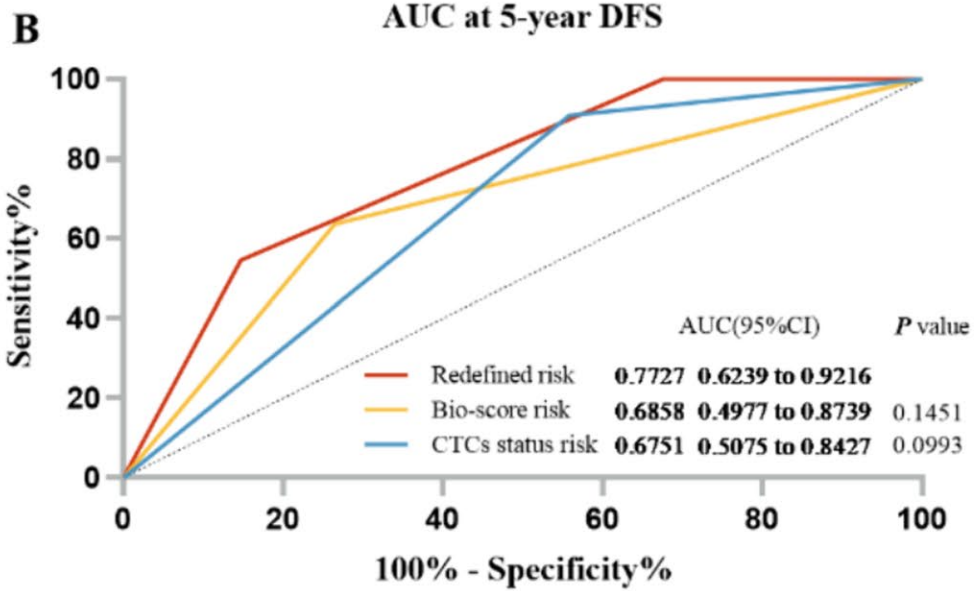 采用ROC曲线比较CTC状态、临床病理风险和新定义的风险分层预测复发风险的敏感性和特异性。在ROC分析中,重新定义的风险分层在ROC下显示了一个区域曲线(AUC)为0.7727,表明与单独的CTC状态或临床病理风险相比,重新定义的风险分层有更好的复发预测能力的趋势(图4)。该结果表明:将CTC状态和临床病理风险结合,对新辅助化疗后III期乳腺癌复发风险预测更精准。