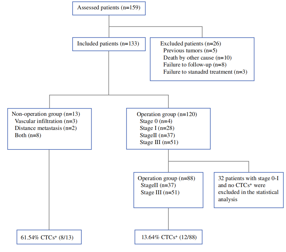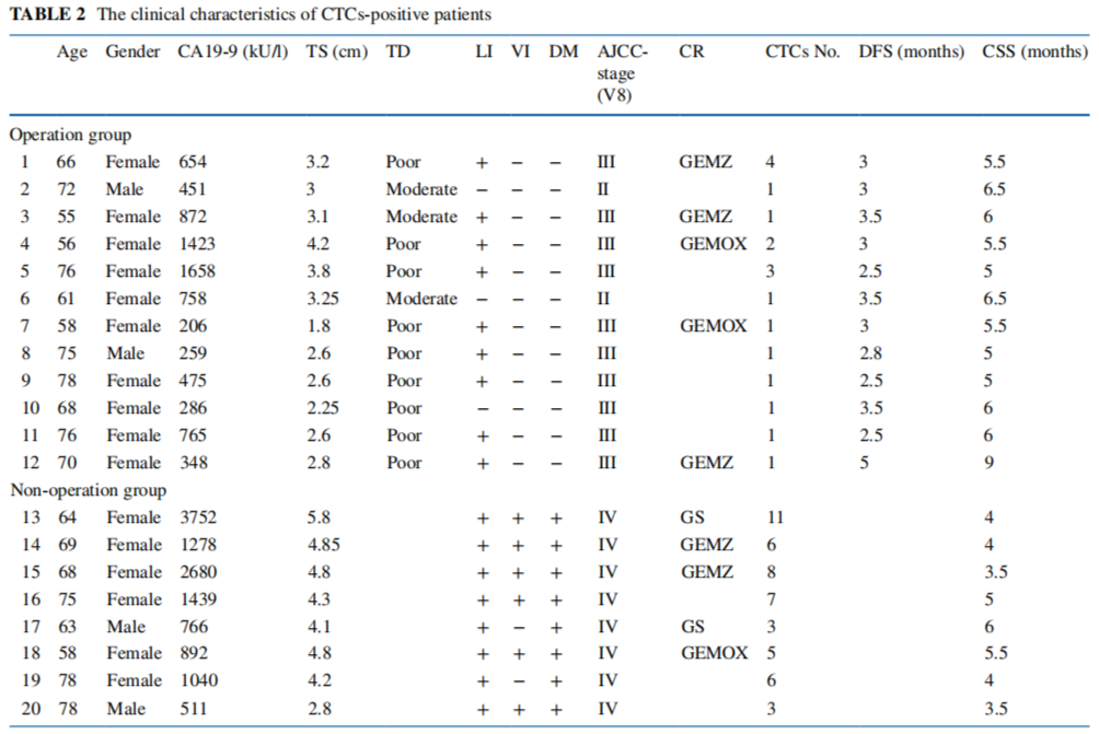 在本研究中,胆囊腺癌切除后患者术前发现CTC与较短的中位CSS和DFS之间有很强的相关性。即使是术前仅检测到1例CTC的患者,手术组的中位CSS和DFS也明显短于III期CTC阴性患者。结果显示,CTC的存在对胆囊腺癌切除后的患者有明显的不良预后影响。CTC阳性患者与CTCs阴性患者相比,中位CSS和DFS更短;此外,有趣的是手术组CTC阳性患者与非手术组晚期患者的生存时间相似,说明即使CT或MRI上未发现血管扩张和/或远处转移,术前CTC阳性患者也应谨慎进行手术切除。