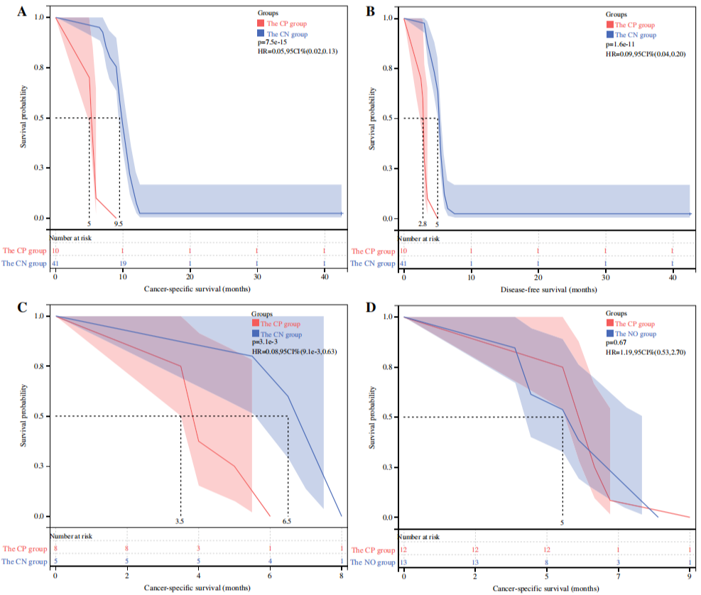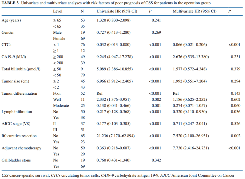 在单因素分析中,手术组患者CSS差的预测因素为CTC阳性(P<0.001)、CA19-9≥200 kU/l(P<0.001)、总胆红素≥50µmol/l(P<0.001)、肿瘤大小≥2 cm(P<0.001)、肿瘤分化差(P<0.001)、淋巴膨胀(P<0.001)、AJCC III期(P<0.001)、无R0切除(P<0.001)、不加辅助化疗(P<0.001)等。因此,研究将这些变量纳入多变量分析,结果显示术前检测CTC仍然是不良预后的独立危险因素(HR 0.066,95% CI 0.021–0.206,P<0.001)。