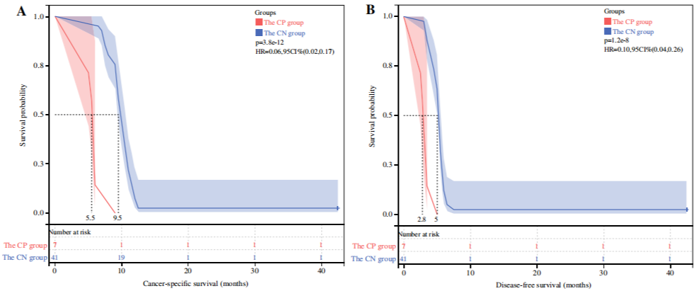 手术组7例III期仅1例CTC,分别进行分析。此外,结果显示,CTC阴性患者的中位CSS(9.5个月VS 5.5个月,P<0.001)和DFS(5.0个月VS 2.8个月,P<0.001)。