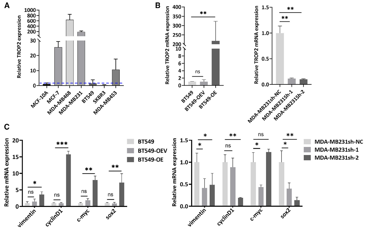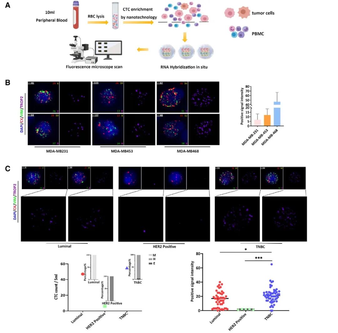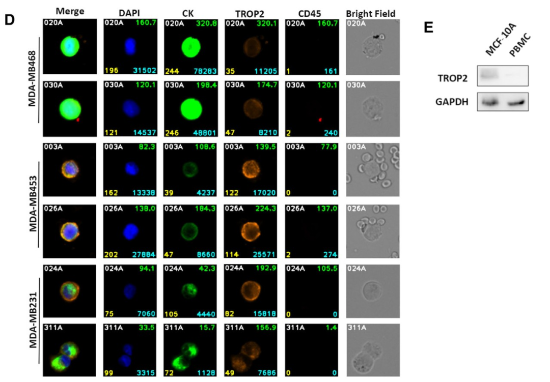 该研究表明,TROP2在TNBC中特别高表达,并促进BC细胞的迁移和侵袭。TROP2作为TNBC中EMT CTCs的潜在生物标志物的特异性和应用性在细胞系和临床血液样本中得到了验证。未来的研究是需要提供更多关于与抗TROP2 ADC伴随诊断和检测更多类型CTC相关的液体活检的数据。