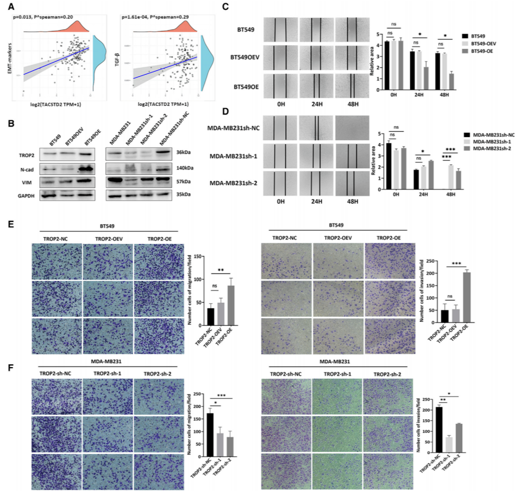 ▲图3 TROP2通过上调TNBC细胞中的间充质标记物促进侵袭