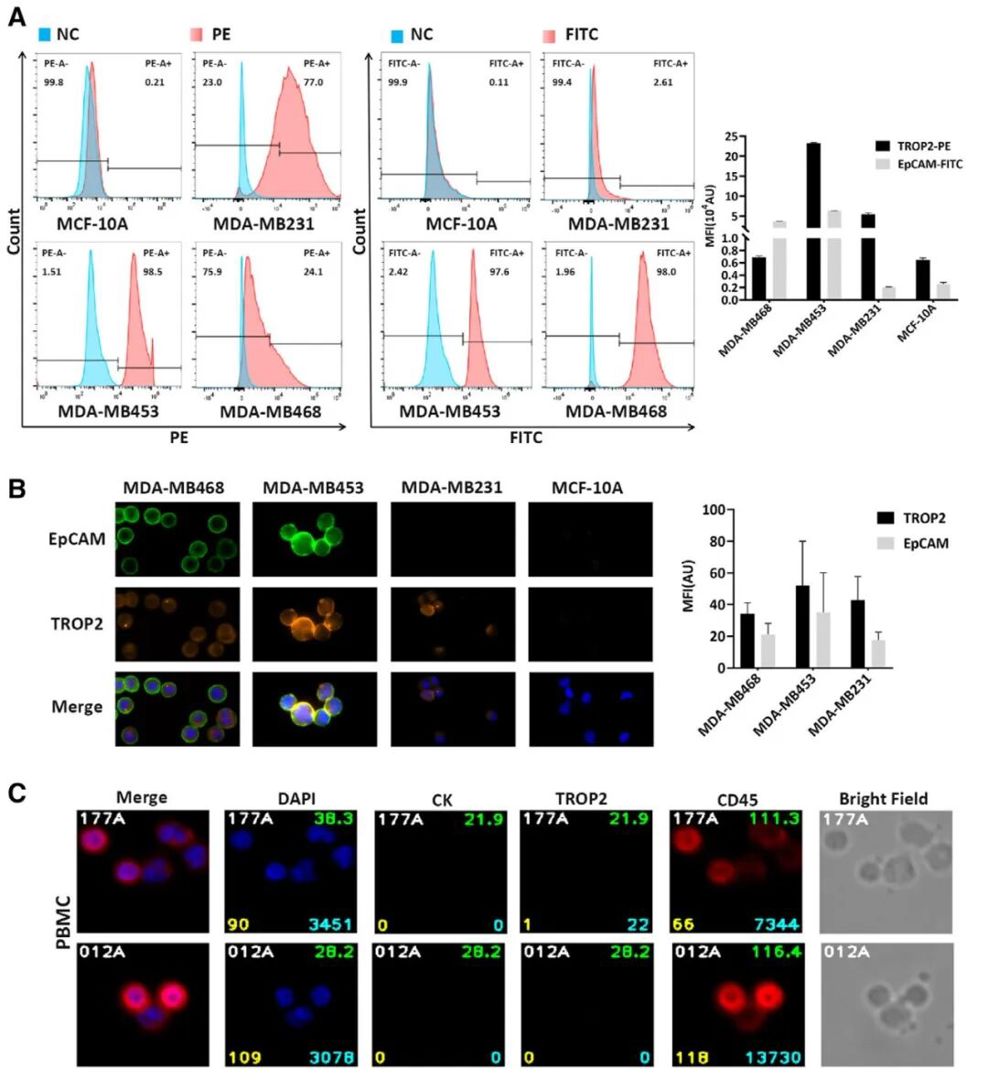 TROP2靶向ADC已用于治疗某些类型的实体瘤。针对TROP2的ADC靶点Sacituzumab-govitecan最近被批准用于治疗晚期姑息性TNBC。因此,TROP2可能是检测TNBC中CTC的新标记物。此外,TROP2与经典肿瘤标志物EpCAM属于相同的TACSTD基因家族。为了评估TROP2作为CTC标记的特异性,使用流式细胞术和细胞免疫荧光(IF)来鉴定TROP2和EpCAM在TNBC细胞和MCF-10A中的表达(图4A和4B)。然后通过IF分析它们在来自健康对照的外周血单核细胞(PBMC)中的表达,以确定它们作为CTC的新生物标志物的特异性(图4C)。蛋白质印迹结果还显示TROP2在MCF-10A细胞和PBMC中的低表达或缺失(图4E)。