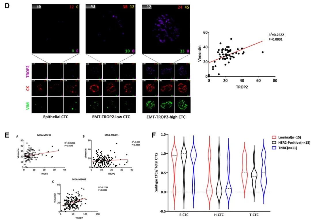 TROP2在不同的TNBC细胞中被高度释放(图5B),这与图2A所示的qRT-PCR结果基本一致,证明了使用CanPatrol® CTC检测平台通过TROP2检测临床血液CTC的可行性。此外,结果显示TROP2的表达水平与间充质标记物波形蛋白呈正相关,尤其是在MDA-MB231和MDA-MB468细胞中(图5E)。然后使用CanPatrol® CTC测定平台对总共39个血液样本中的CTC进行计数和分型,包括luminal、HER2+BC患者和TNBC。管腔、HER2+BC和TNBC中不同类型CTC与总CTC的比率如图5F所示。在TNBC患者中,混合上皮-间充质CTC比例更多。此外,TROP2在患有TNBC的CTC患者中表达更高,在HER2+患者中表达较低,尽管TROP2的表达水平在管腔BC患者的CTC中也很高,并且与临床病理肿瘤分析联合会(CPTAC)数据库信息(图1B)和BC细胞qRT-PCR结果(图2A)一致。具体来说,我们分析了每种BC亚型的典型病例。TNBC患者(P3030)的CTC中TROP2表达水平显著高于HER2+患者(P4187)。尽管在管腔BC患者的CTC中检测到较高的TROP2表达(P2997),但其显著低于TNBC患者(图5C)。更有趣的是,我们发现在TNBC患者中,TROP2在上皮CTC中不表达或低水平表达,并且随着TNBC的增加而高表达混合上皮-间充质CTC中EMT的水平。TROP2的表达水平与间充质标志物的表达水平呈正相关,如图5D所示,表明TROP2有潜力检测TNBC患者中的间充质相关CTC。