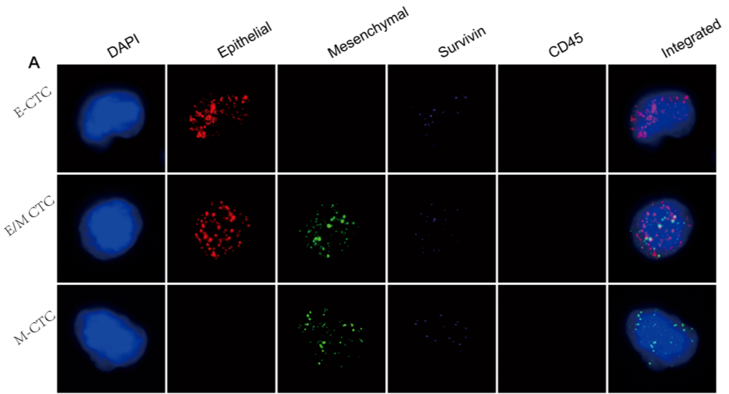 采用CanPatrol® CTC可视化液体活检平台对外周血中CTC进行分离鉴定及EMT分型分析。该技术采用不依赖特定标志物的纳米膜分离方法,全面富集所有类型的CTC及CTC细胞团;通过多重mRNA荧光原位杂交法,即使用多组上皮、间质和CD45探针,实现CTC的EMT分子分型,同时在CTC上进行survivin mRNA检测。生物信息分析结合血常规数据验证survivin与循环系统中免疫细胞浸润的关系。为筛选独立预后因素,采用Kaplan-Meier生存曲线、单因素和多因素Cox回归分析。