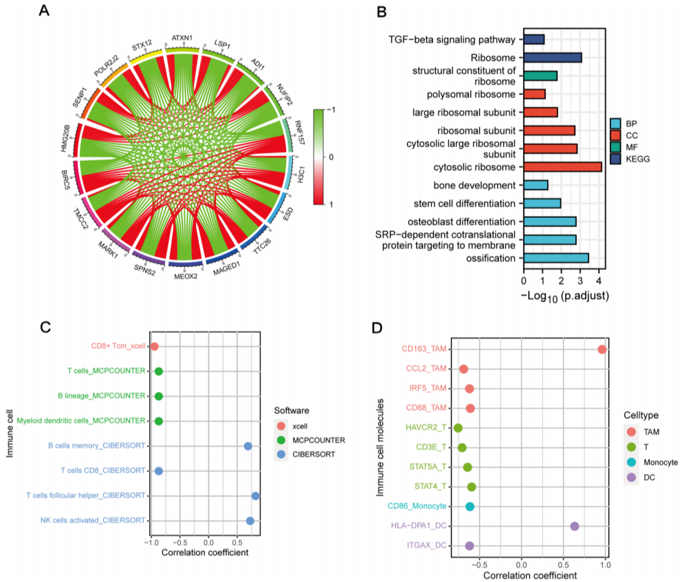 BIRC5基因编码的survivin,在多种癌症的肿瘤微环境中起关键作用。基于GSE140131的单细胞RNA测序数据,获得了5个骨肉瘤CTC的基因表达谱,用于进一步分析。生物信息学分析显示BIRC5与淋巴细胞(包括T细胞、B细胞和NK细胞)呈显著负相关,与T细胞、巨噬细胞、单核细胞和树突状细胞的分子标志物呈负相关。基于生物信息学分析的发现,进一步验证survivin蛋白与循环免疫细胞之间的关系。从患者血常规中采集循环免疫细胞,结果显示,survivin阳性CTC数量与淋巴细胞计数呈负相关,与生物信息学分析结果一致。