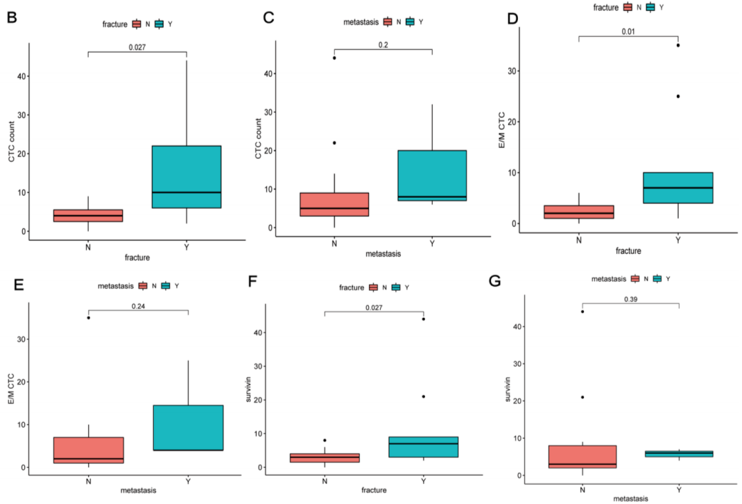 该研究首次证明了CTC中BIRC5(一种编码survivin蛋白的基因)的表达与免疫细胞浸润密切相关。生信分析结果表明survivin+ CTC与淋巴细胞计数呈显著负相关,并且进一步验证了survivin蛋白在免疫逃逸中的关键作用。与早期临床特征进行相关性分析显示CTC和survivin蛋白与患者的转移密切相关,survivin+ CTC是一个独立的预后因素。