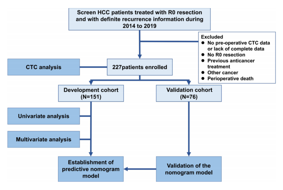 本研究纳入2014年1月至2019年8月期间,共有227名复发性HCC患者,按2:1比例患者被随机分配到实验组和对照组,统计所有患者术前CTC数据和临床病理特征,最终用于EHR预测的术前和术后列线图模型,并进行了多维验证。