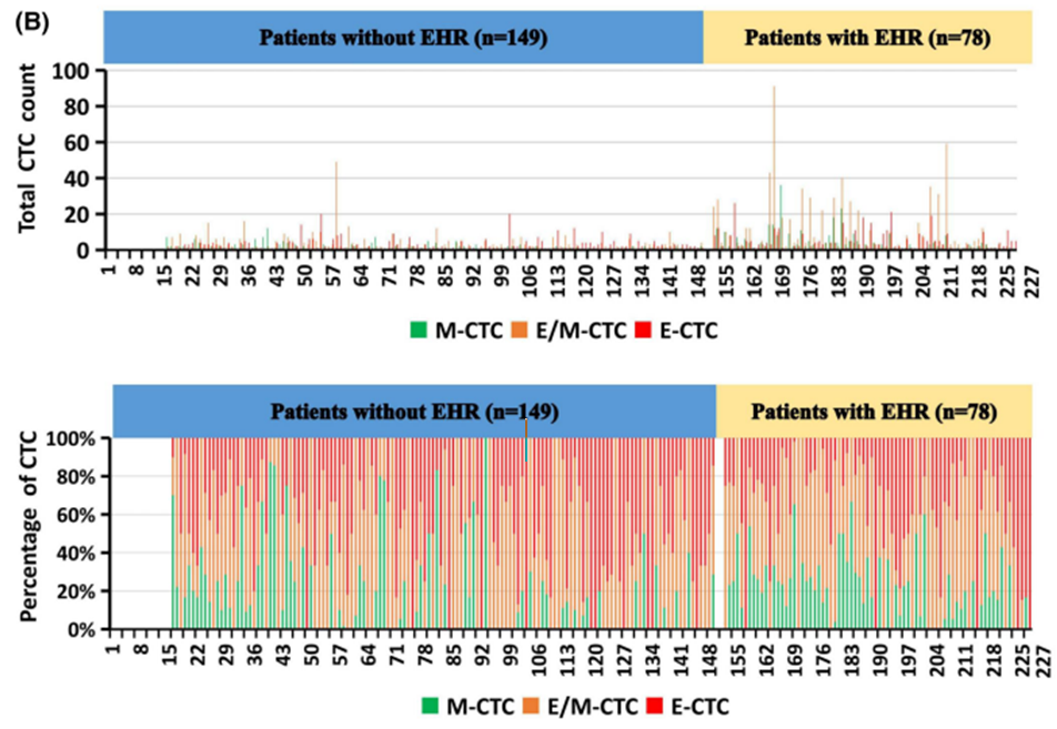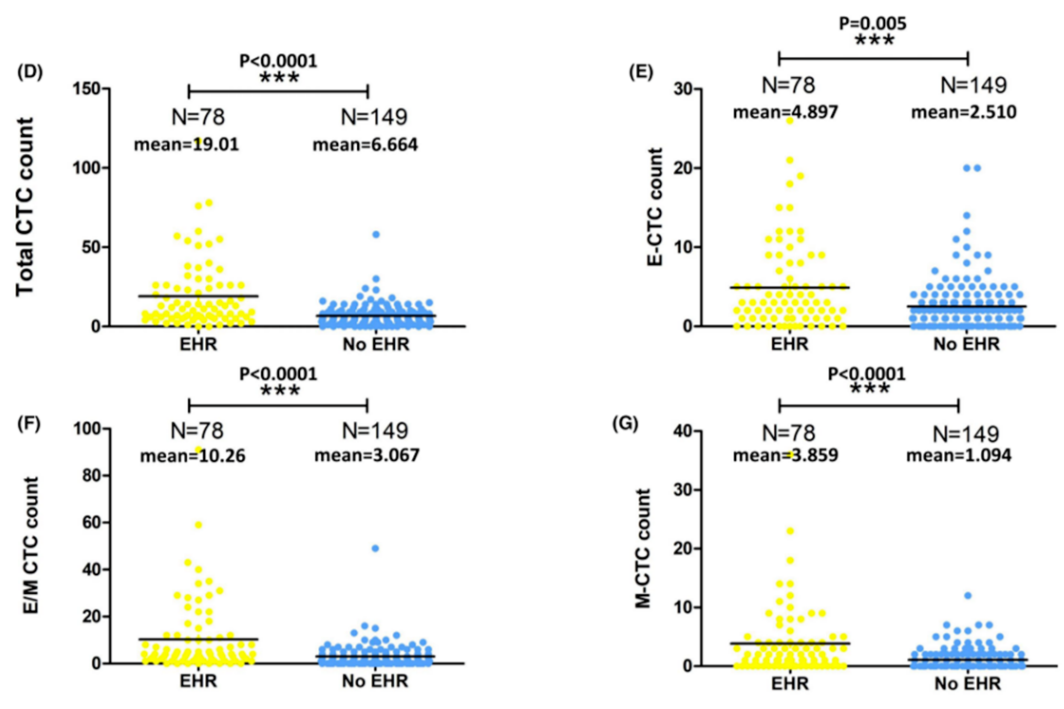 CTC阳性率为92.11%(210/227),EHR患者和非EHR患者分别为97.44%和89.93%。如图所示,EHR患者和非EHR患者的总CTC、E-CTC、E/M-CTC和M-CTC计数有显著差异(均p<0.001)。EHR患者CTC总数和各亚型比例均显著高于非EHR患者;