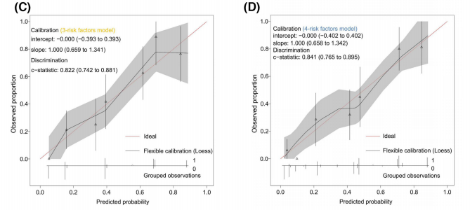 ▲ 三风险因素模型和四个风险因素模型的校准曲线