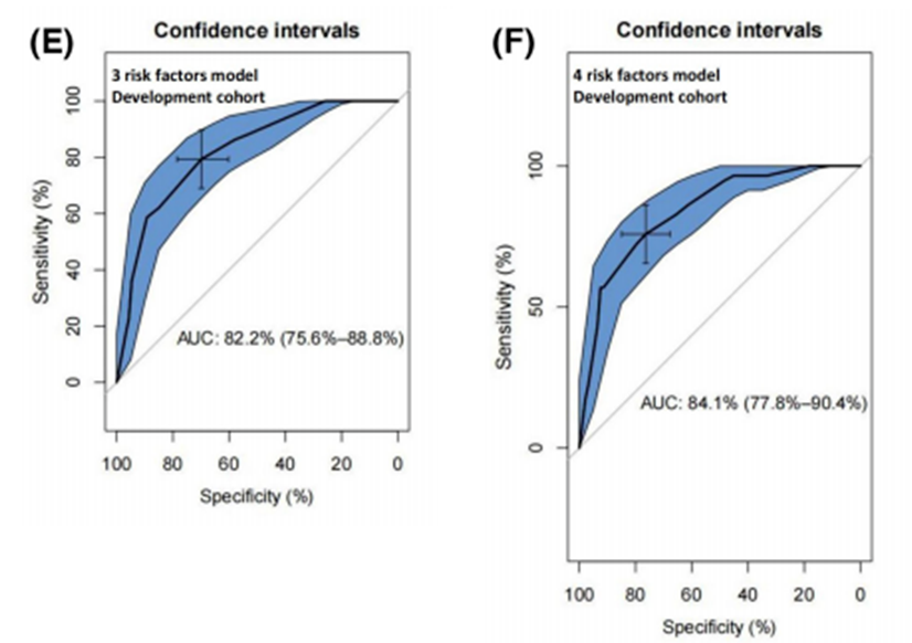 术前三因素预测模型的最佳截止分数为100.3(敏感性:67.8%;特异性:80.5%),术后四因素预测模型的最佳截止得分为176.8(敏感性:73.5%;特异性;79.3%),具有较好的特异性和敏感性。