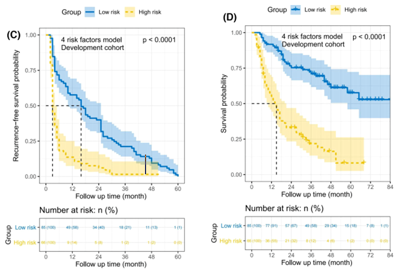 研究发现,EHR患者的无复发生存率(p<0.001)和总生存率(p<0.001)通常较低,并且有显著更高的CTC计数(上皮型CTC、上皮/间质混合CTC和间质型CTC计数,所有p < 0.05)。单因素和多因素分析显示,EHR与实验组的四个危险因素相关:CTC总计数(p=0.014)、肿瘤大小(p=0.028),肝内病灶数(p = 0.045)和微血管侵犯(p=0.035)。术前和术后两个列线图预测模型都展示了良好的肝外复发预测性能。